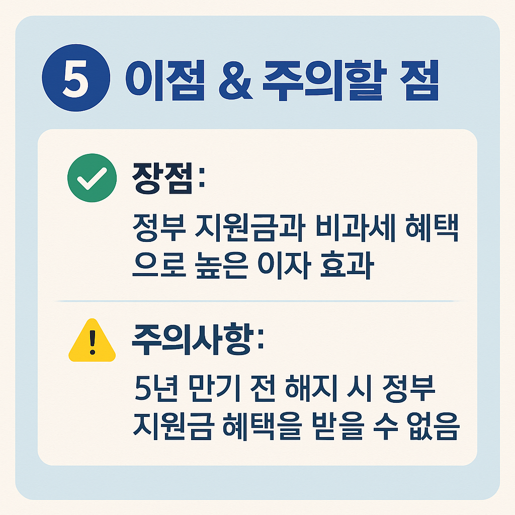 - ✔️ 5년 만기 전 해지 시: ➡️ 만기 이전에 계좌를 해지할 경우 정부 지원금 혜택을 받을 수 없어요.