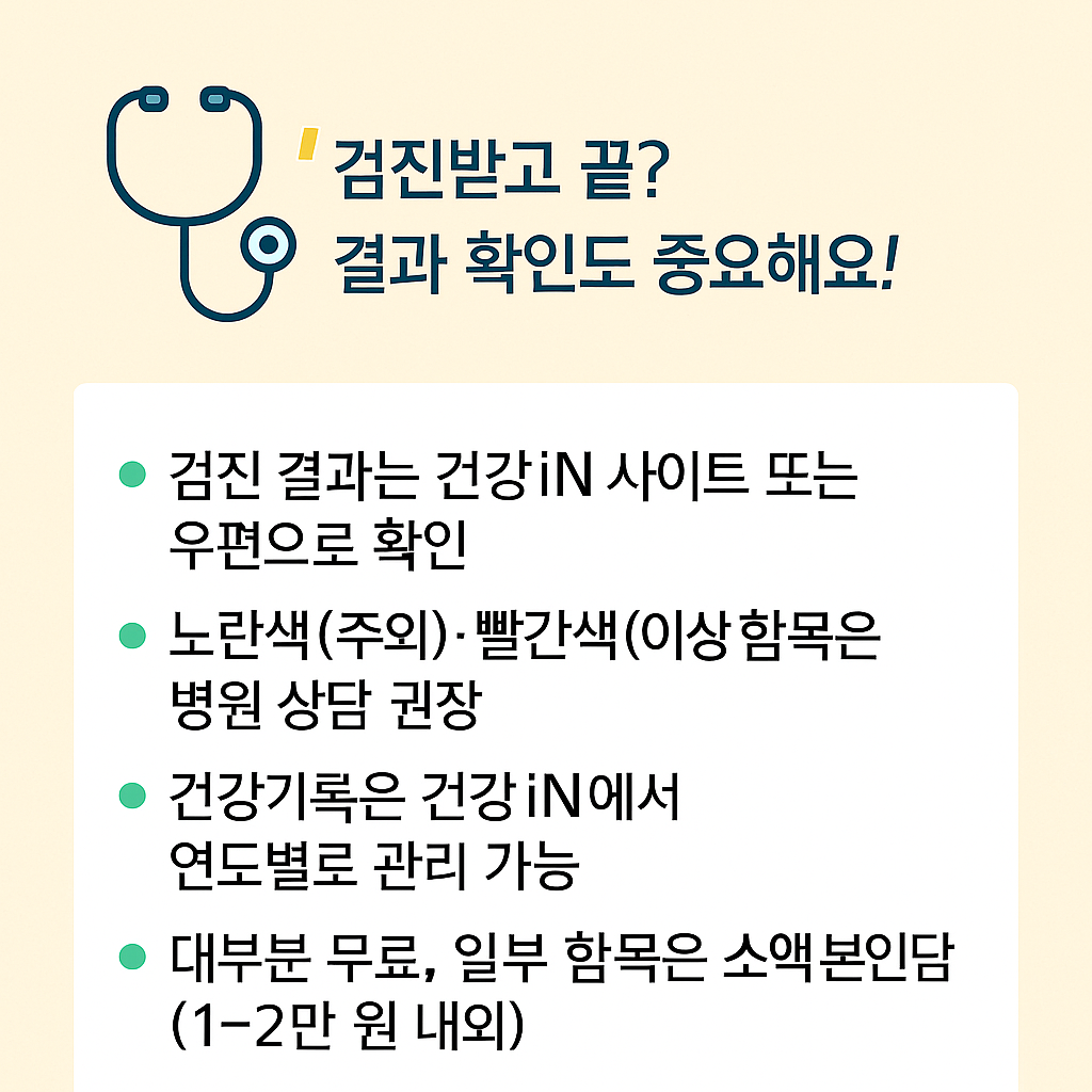 📌 특히 혈압, 혈당, 콜레스테롤, 간수치 항목은 평소 생활습관과 직결되므로, 수치가 높게 나왔다면