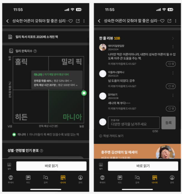 책을 선택해서 들어가 스크롤을 내리면 '완독지수'라는 것이 뜬다. 이책을 읽었던 사람들을 분석한 것인데 이것을 보고 내가 완독할 수 있을지 대충 짐작하는데 도움이 되었다. 그리고 책에 대한 리뷰들을 한눈에 확인할 수 있던 점이 좋았다.