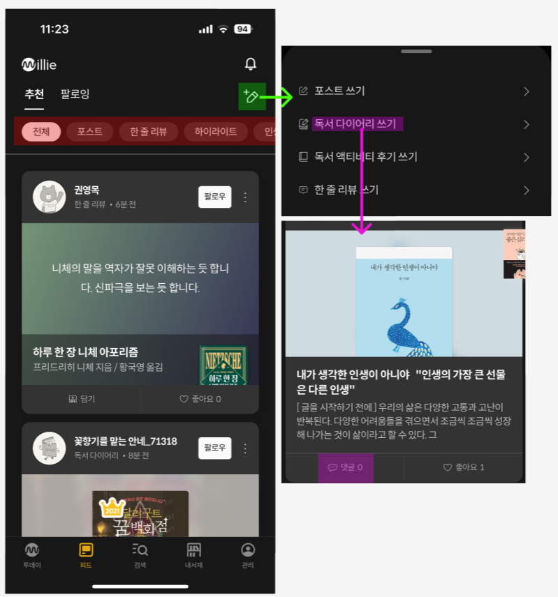 밀리의 서재의 특이한 점은 피드가 존재한다는 것이다. 피드는 우리가 알고 있는 인스타그램,페이스북등 그 기능과 유사하다. 초록상자를 눌러 글을 쓸수 있고 다이어리를 쓰면 핑크상자와 같이 댓글을 쓸수 있는 기능이 존재한다. 댓글을 통해 다른 사람들과 소통을 할 수 있다는 점이 셀링포인트였다.