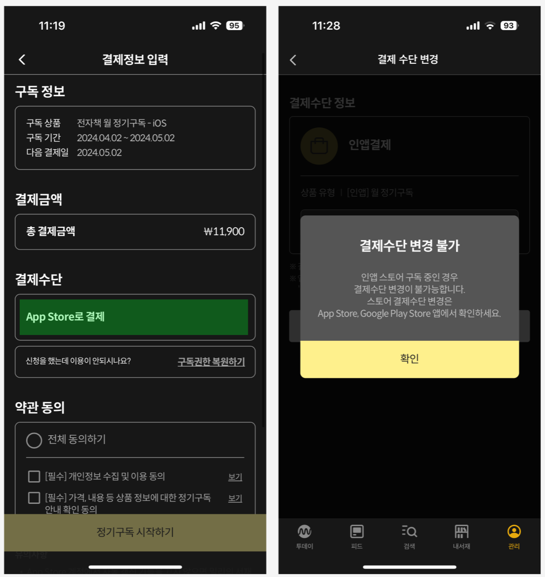 구독을 하기 위해 결제하려면 수단을 선택해야하는데 초록박스를 보면 아이폰 유저들은 앱스토어에서만 결제가 가능하다. 박스를 클릭해도 다른 선택지가 뜨거나 안내창이 뜨지 않았고 결제 후에 구독관리를 통해 결제 수단변경할 수 있는 창에서도 오른쪽 이미지와 같은 안내창이 떴다.