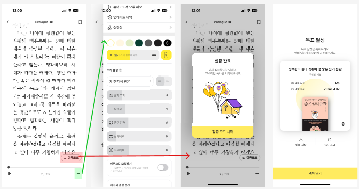 구독권을 끊고 책을 골라서 읽기시작하면 첫번째 이미지와 같은 화면이 뜬다. 처음에는 글씨크기가 너무 커서 놀랬는데 화면 정중앙을 한번 터치하면 메뉴바가 떠서 클릭하면 두번째 이미지처럼 뜬다. 저기서 글씨크기 간격등 많은 것을 설정 할 수 있어 놀라웠다! 이러한 부분이 셀링포인트로 작용되었고 하단에 집중모드라는 것을 클릭해서 시간/페이지 단위로 설정을 하면 내가 설정한 페이지 또는 시간을 채웠을 경우 목표달성 창이 뜬다.