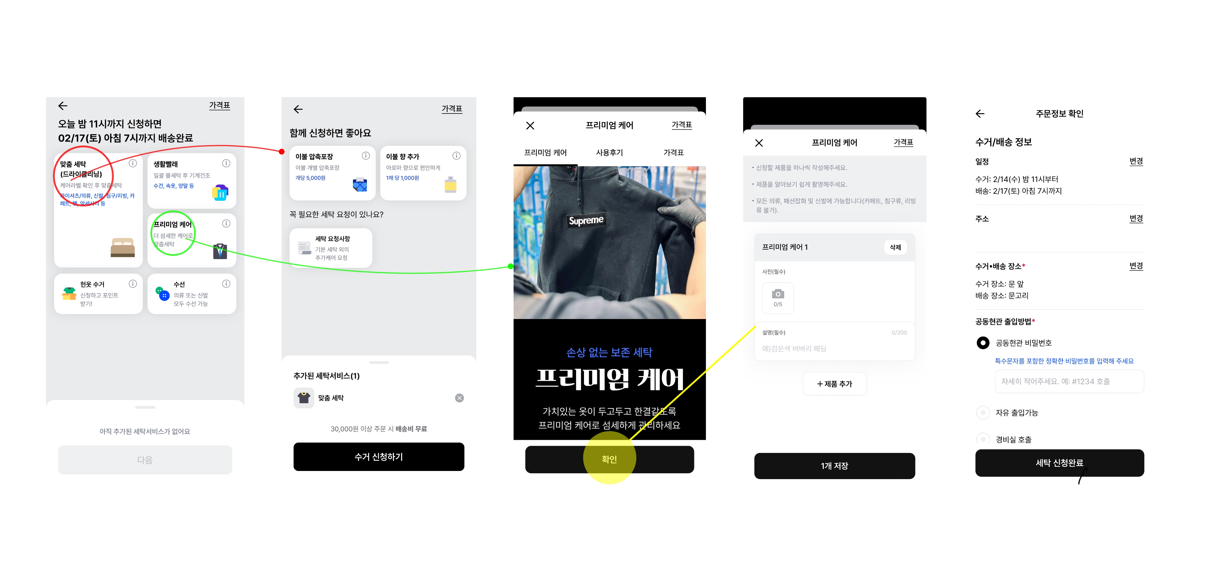 같이 다른 화면이 나타난다. 프리미엄 케어화면에서는 사진을 필수로 찍어 세탁할 물건 상태를 소비자가 직접 확인 할 수 있도록 만든점이 신선했다. 세탁물을 선택하고 난 뒤 주문정보 확인창에는 일정이 포함 되어 언제 받을 수 있으며 소비자는