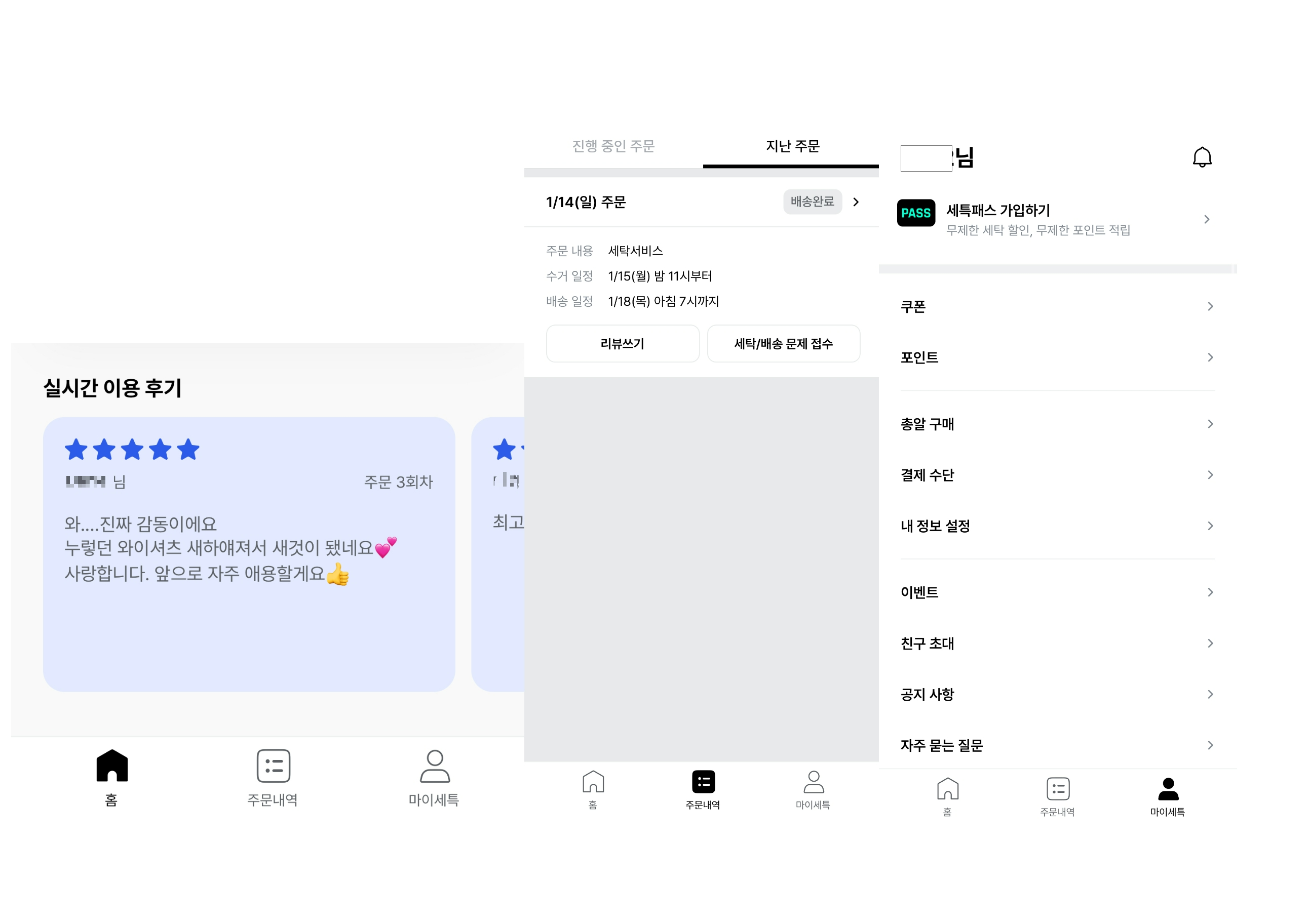 2. 하단 네비게이션 바는 홈,주문내역,마이세특으로 나뉘어져 있으며 홈 화면에서 '이런 서비스는 어때요?'를 통해