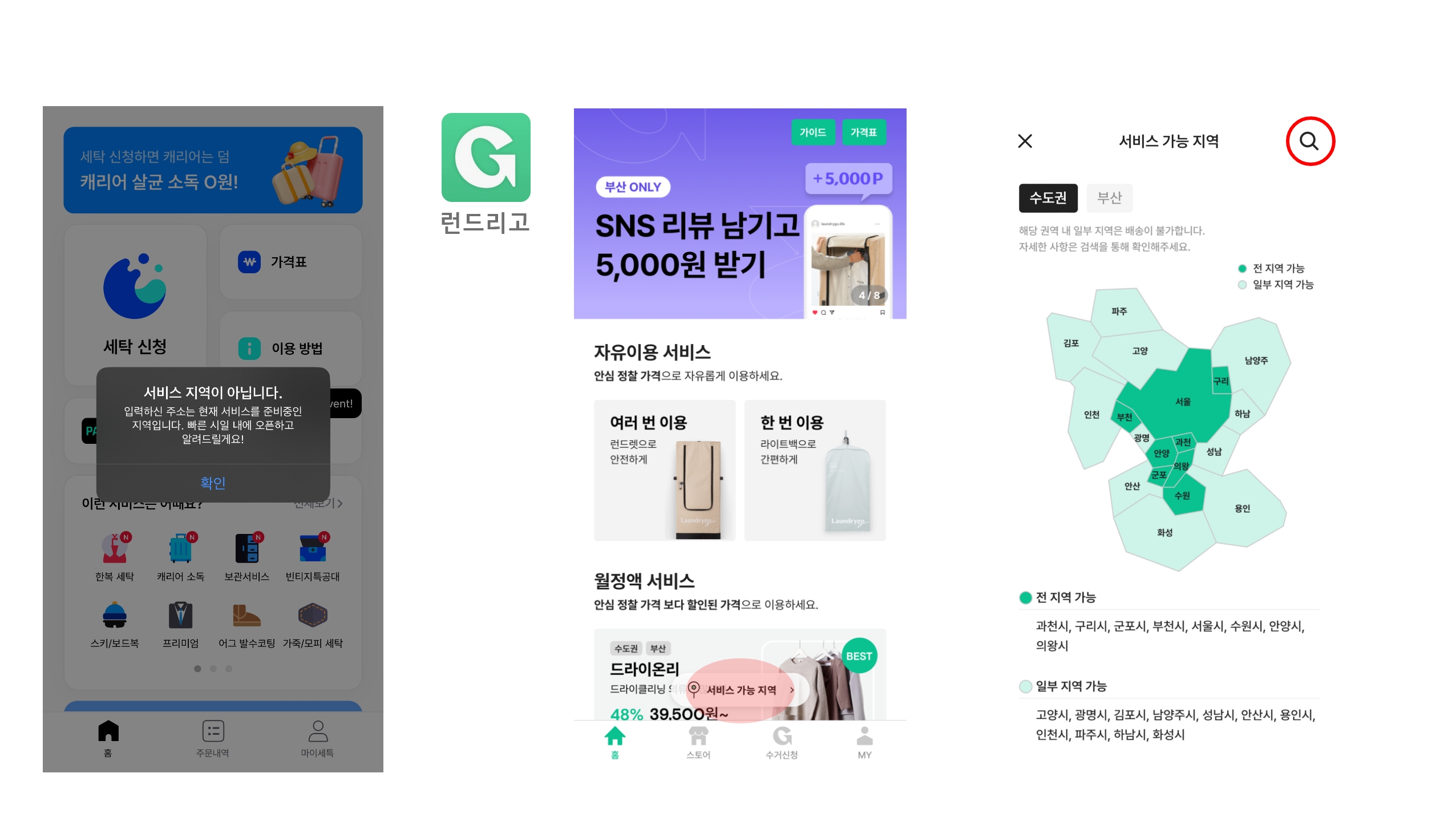 2. '세탁특공대'어플 화면에서는 '런드리고'처럼 서비스 가능지역을 확인 할 수 있는 창이 없었다.