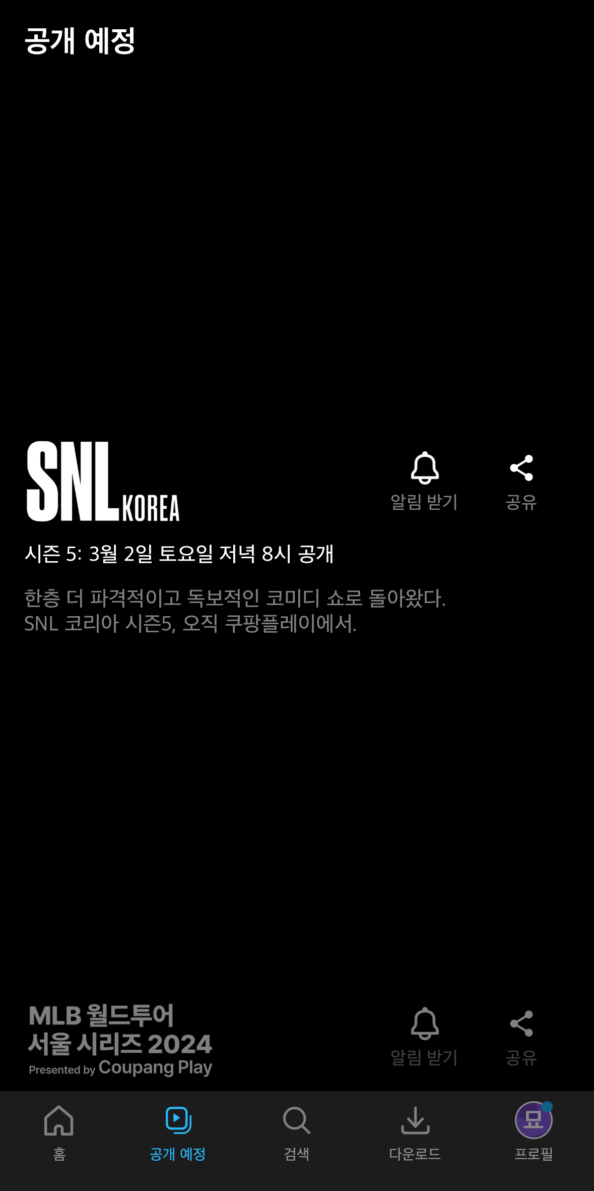 공개 예정 페이지가 따로 있는 경우도 쿠팡플레이에서 처음본다. 물론 내가 모든 어플을 사용해 본건 아니지만