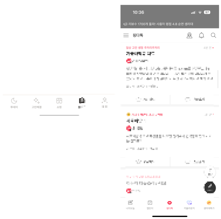 다른 생리주기 어플은 커뮤니티 영역이 활성화 되어있어서 친구들에게 하지못한 시시콜콜한 이야기들을 서로 나눌 수 있어 편해 보이며 좋았다.