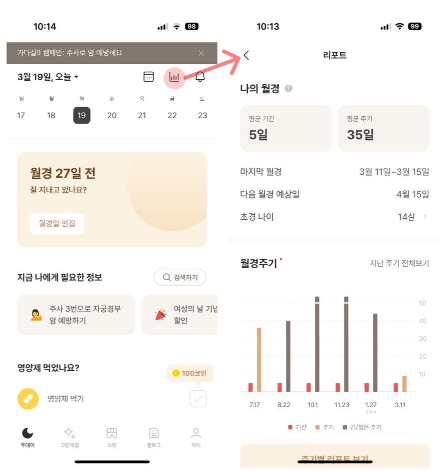 주기가 일정하지 않은 사람이라면 이부분에 들어가 평균주기를 알 수 있어 좋았고, 주기가 일정하다면 다음 월경 예상일을
