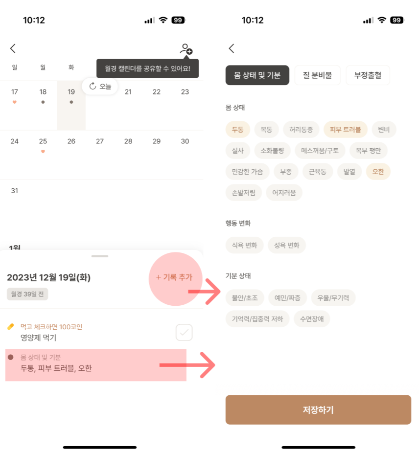 캘린더를 들어가면 왼쪽과 같은 화면이 뜨는데 거기서 오늘의 몸상태나 성관계 유무를 기록 할 수 있다.