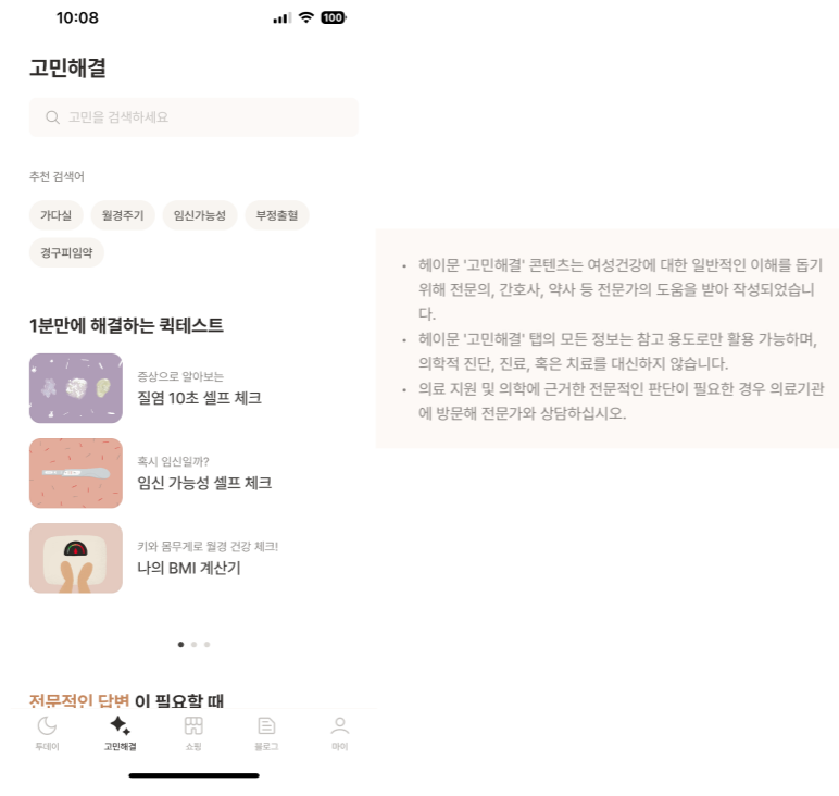 사용자들이 궁금한 점을 질문 할 수 있는 고민 해결 페이지가 있다. 고민해결 페이지에서 질문을 하면 거기에 대한 답변을 전문가들의 도움을 받아서 작성되었다는 점이 셀링포인트였다.