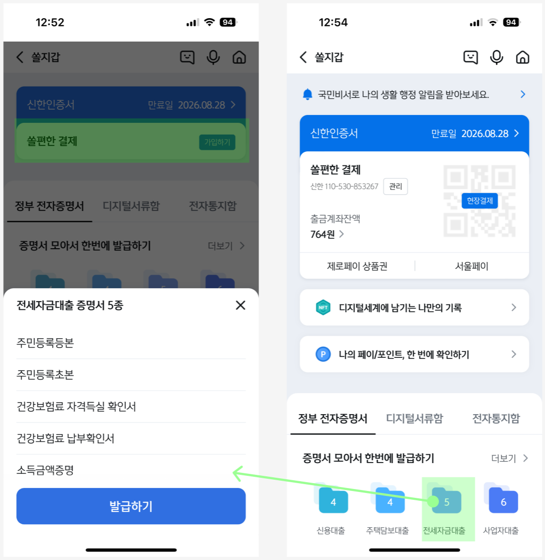 홈화면에 있는 쏠지갑을 들어가서 쏠편한 결제라는 서비스가 있다. 이부분을 클릭해서 가입하면 간단한 정보동의를 하고 들어가면 오른쪽과 같은 화면이 뜬다. 쏠지갑 가입하면 오프라인에서도 실물카드 없이 결제가 가능한 QR코드가 생성된다.그리고 대출에 필요한 서유를 한번에 확인 가능하며 이러한서류를 발급하기 버튼하나로 해결 할 수 있다는 점이 셀링포인트로 작용되었다.