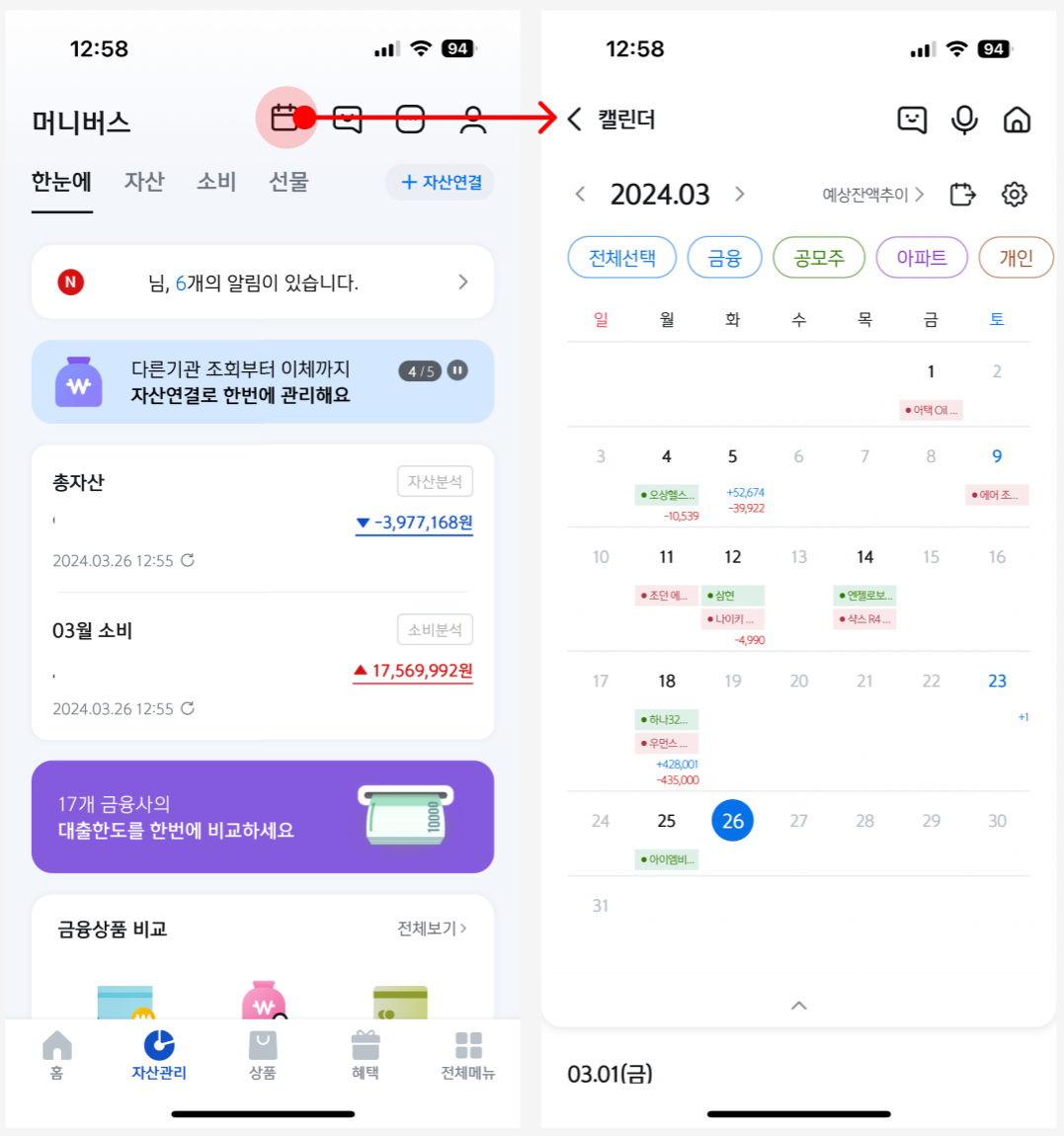 자산관리 화면에 들어가서 위 오른쪽을 보면 달력모양 아이콘이 존재한다. 아이콘의 이름은 캘린더이며 캘린더에 들어가면, 이미지와 같이 공모주나 청약날짜등 다양한 정보를 확인 할 수 있다. 그리고 가운데 카테고리 선택을 통해 내가 보기원하는 정보만 선택하여 확인이 가능하다.